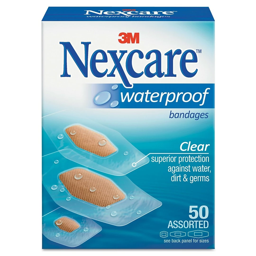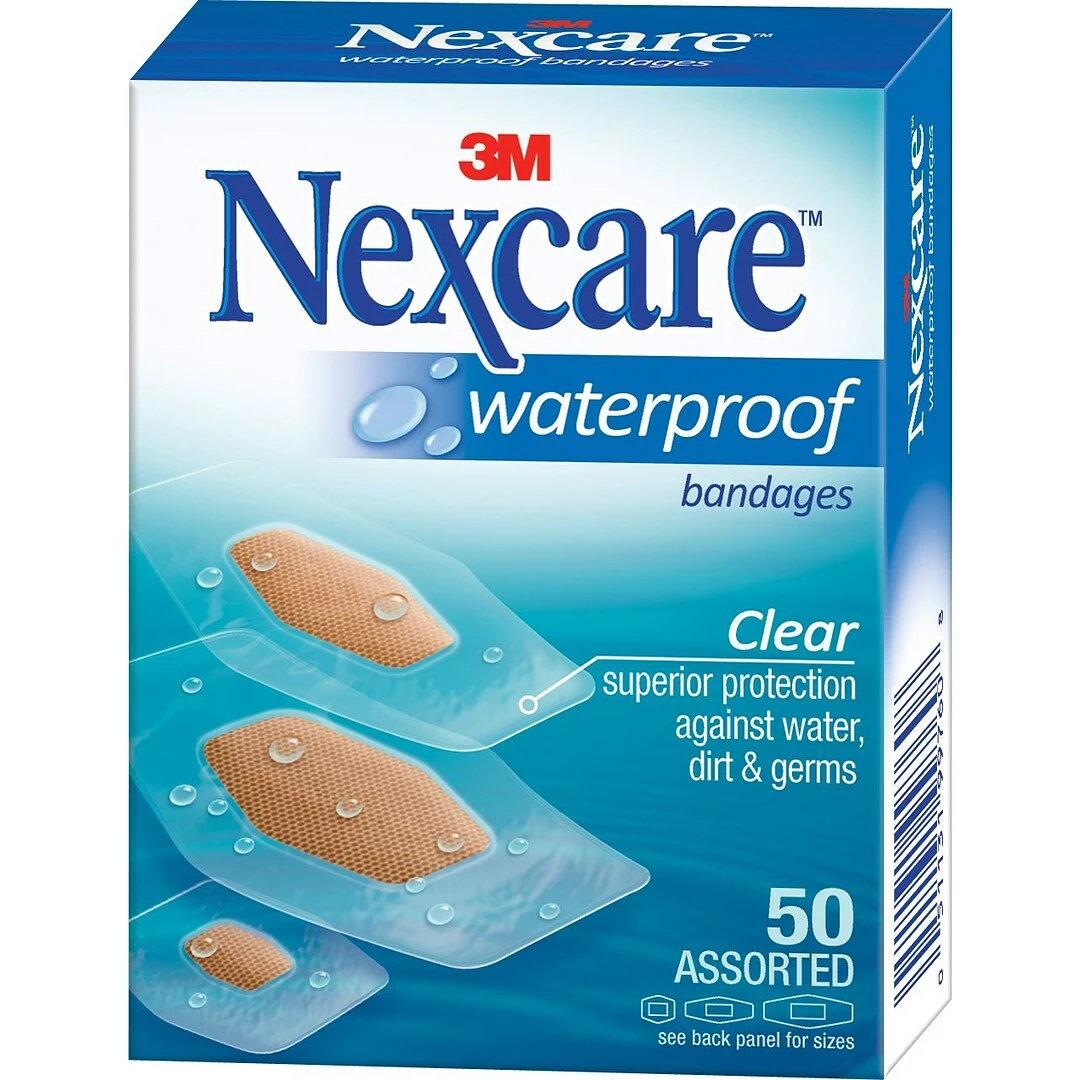Designed to stay on in wet conditions and keep the water out, Nexcareâ„¢ Waterproof Bandages protect minor wounds like scrapes, cuts and blisters during cooking, cleaning, exercising, gardening, swimming, fishing and other outdoor activities. Ultra thin, breathable construction with a 360 degree seal that protects against water, dirt and germs to help prevent infection. Made with a clear flexible backing and non stick pad, these bandages easily adhere and conform to fingers, elbows, knees and other hard to cover parts. Nexcareâ„¢ Waterproof Bandages deserve a spot in every first aid kit, offering reliable wound care that keeps you moving at your everyday pace.