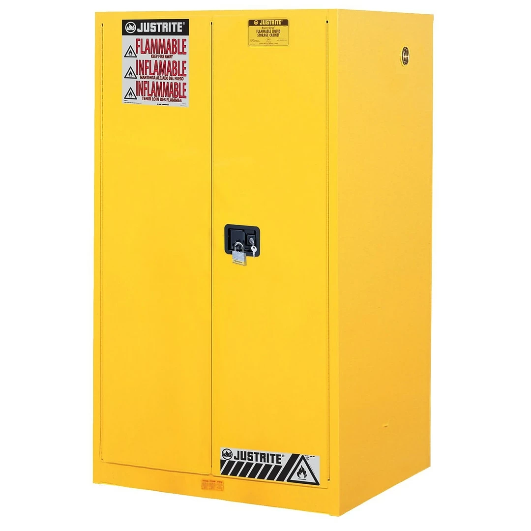 JustriteĀ® 45 Gal safety cabinet is painted inside and outside with lead-free paint for maximum chemical resistance. Cabinet has pad lockable handle and ensures maximum protection with its self-latching doors.