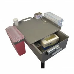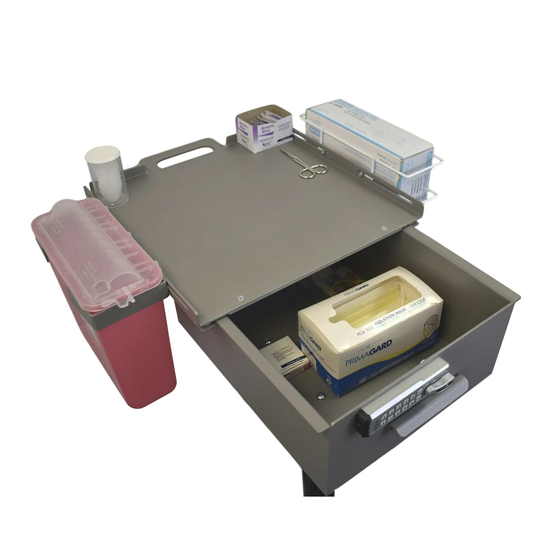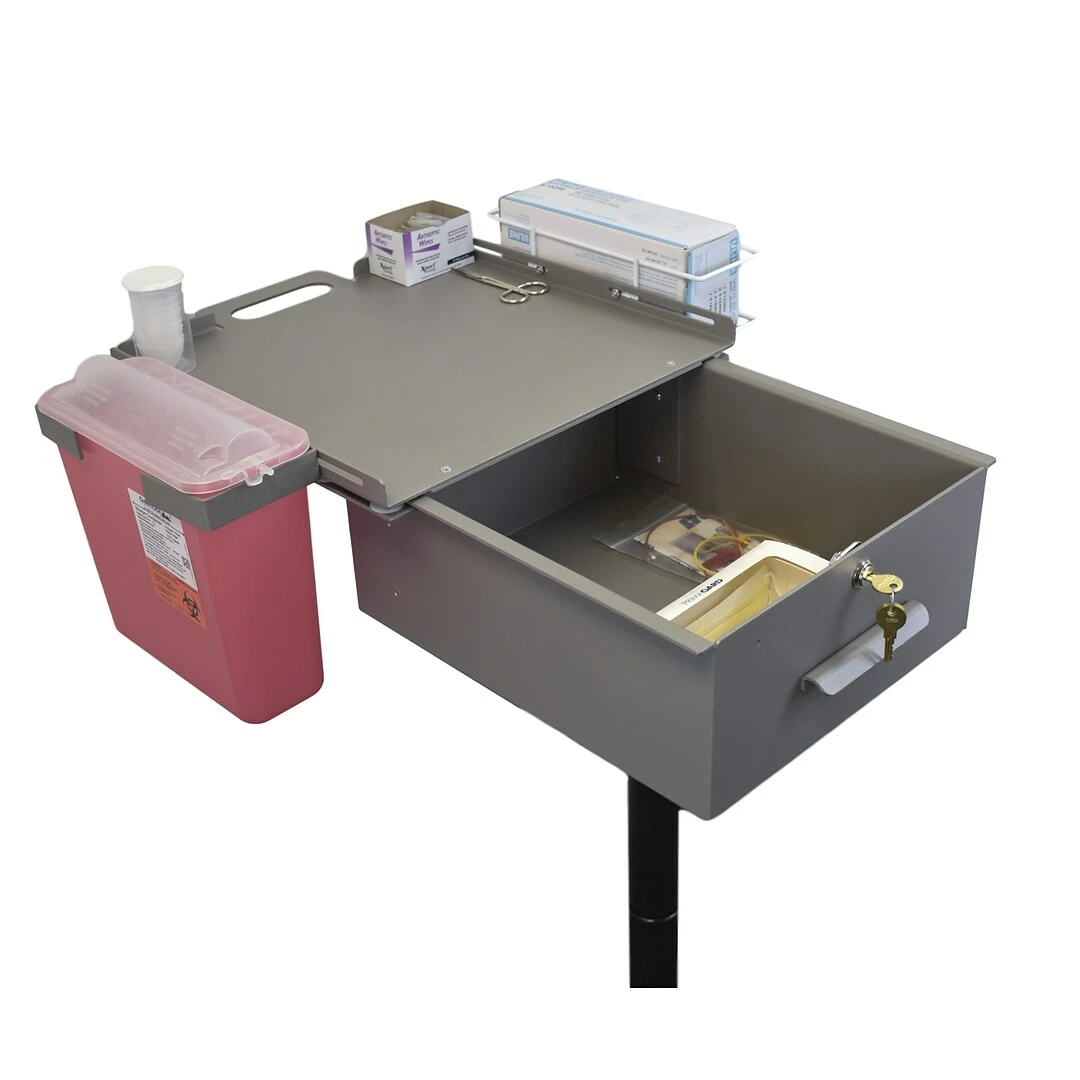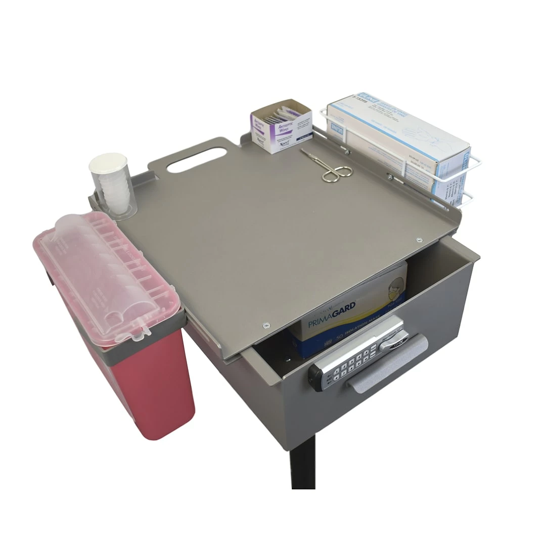 Our Phlebotomy Cart comes with all the amenities of a much more expensive competitor. It is height adjustable (from 36” to 46”). It has a large drawer for supplies. The drawer is available with a flat key lock, thumb latch or electronic lock. The innovative surface smoothly slides back to expose the contents of the drawer. The cart also includes a single glove box holder as well as adjustable brackets to holder numerous sized sharps containers (sharps container not included). The surface and drawer are fabricated from 1/8” painted aluminum. The painted aluminum will withstand years of abuse and disinfectants.