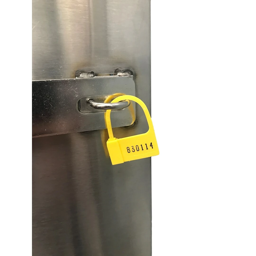 The Omnimed Safety Control Seals with Numbers have a brightly colored plastic body with a flexible locking piece which threads into the body. These seals are designed for a narrow slot opening. Each is imprinted with a unique tracking number and can be broken without tools. Seals can be used on cabinets where contents need to be controlled. They provide a clear visual signal and also serve as a deterrent to prevent unauthorized cabinet access. Seals are sold in 100 count packages and come in red, green or yellow.