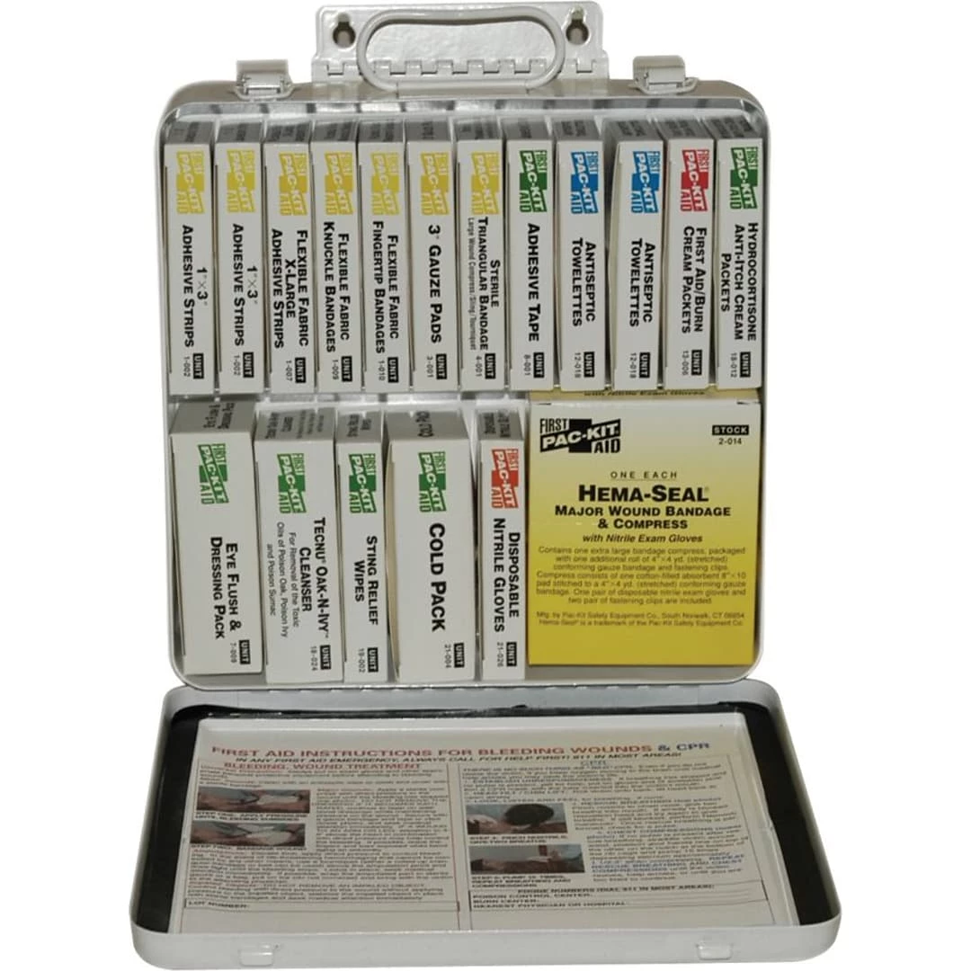 The convenient Pac-Kit® First Aid Kit is a weatherproof steel kit that includes everything needed for dressing wounds.