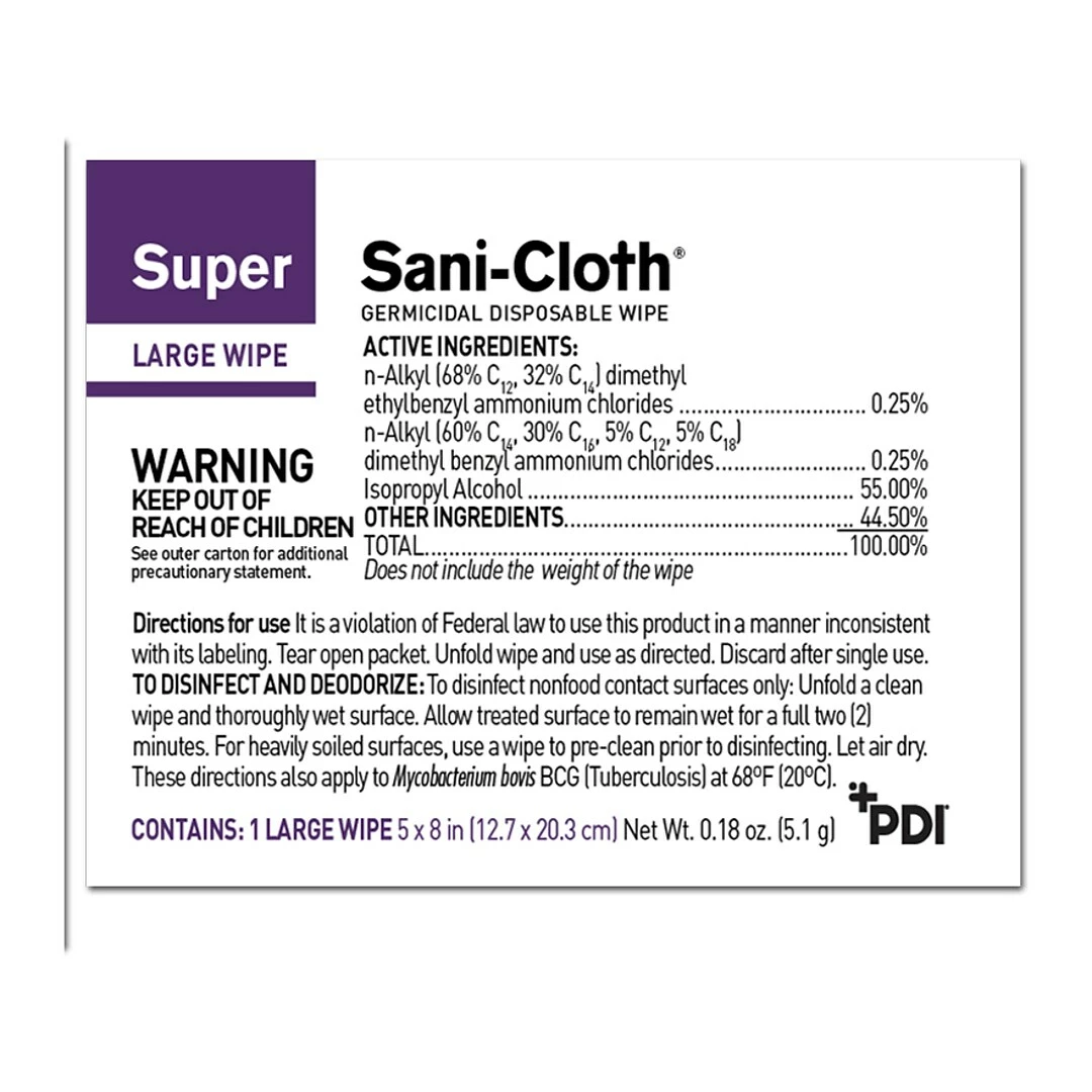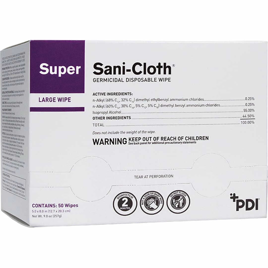 The PDI Sani-Cloth Super large germicidal disposable wipes are effective against 32 microorganisms in 2 minutes. Fast contact time allows for a quick room turnover. Great for daily use in fast-paced environments that require short contact times and broad coverage of microorganisms. Now effective against SARS-CoV-2, the virus that causes COVID-19, and Candida auris.