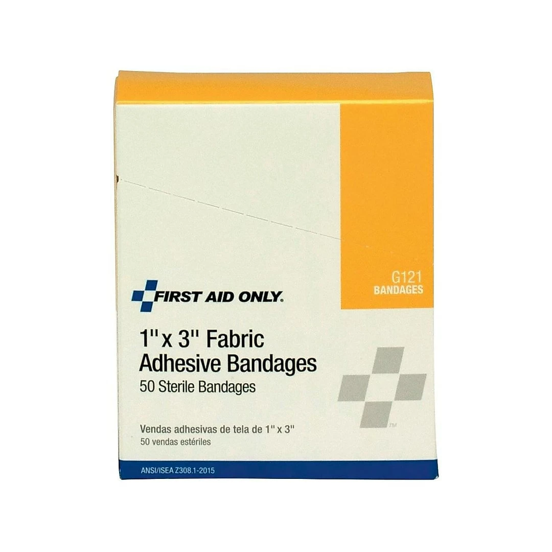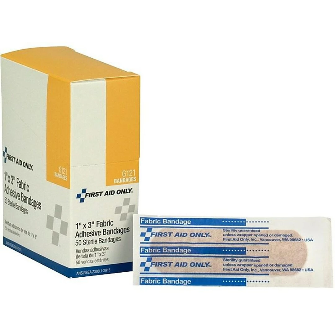 Cover scrapes, cuts, and puncture wounds with these adhesive bandages. The latex-free heavy-woven fabric provides ventilation to let skin breathe, and they repel dirt and water to aid in the natural healing process. These First Aid Only fabric bandages are packaged in a perforated box, so you can easily grab one sterile bandage at a time for fast applications, and the box is perfectly sized for stocking first aid kits or cabinets.