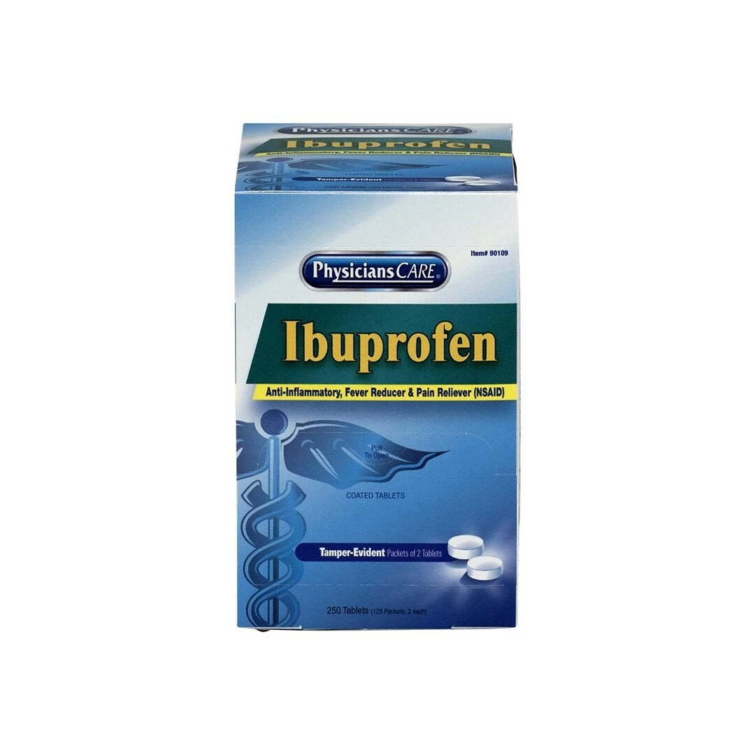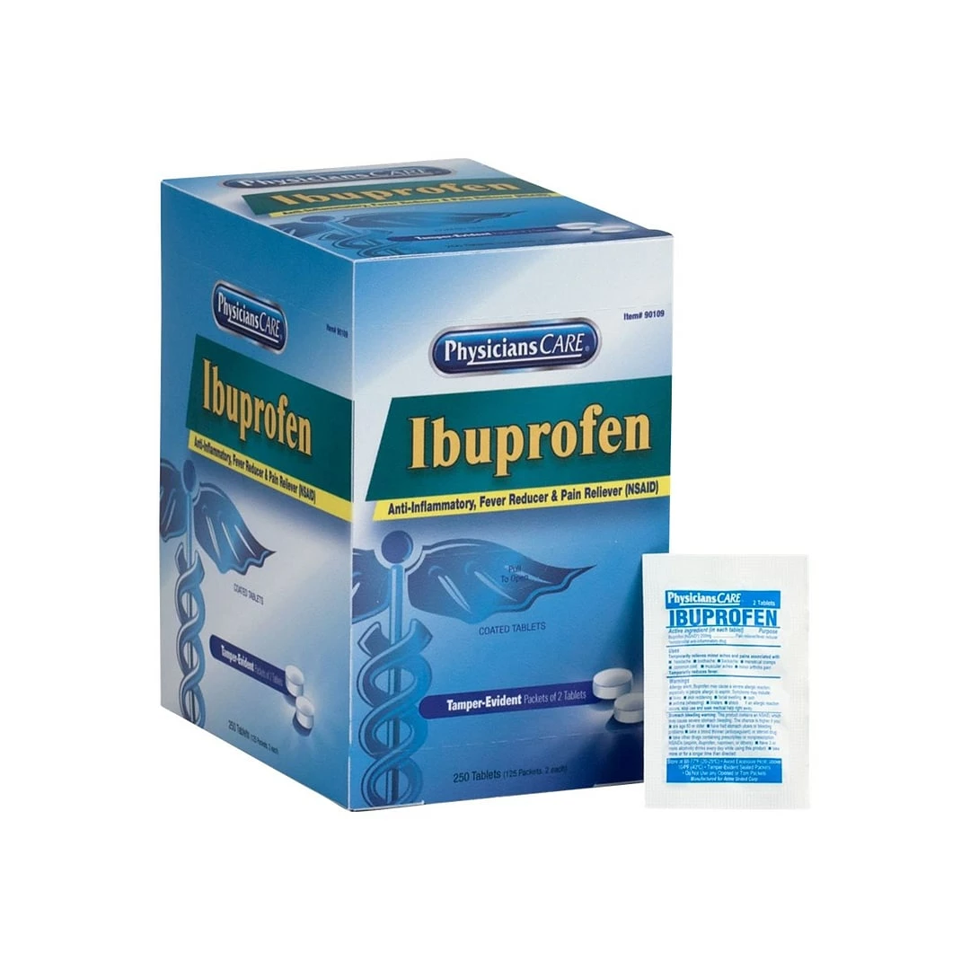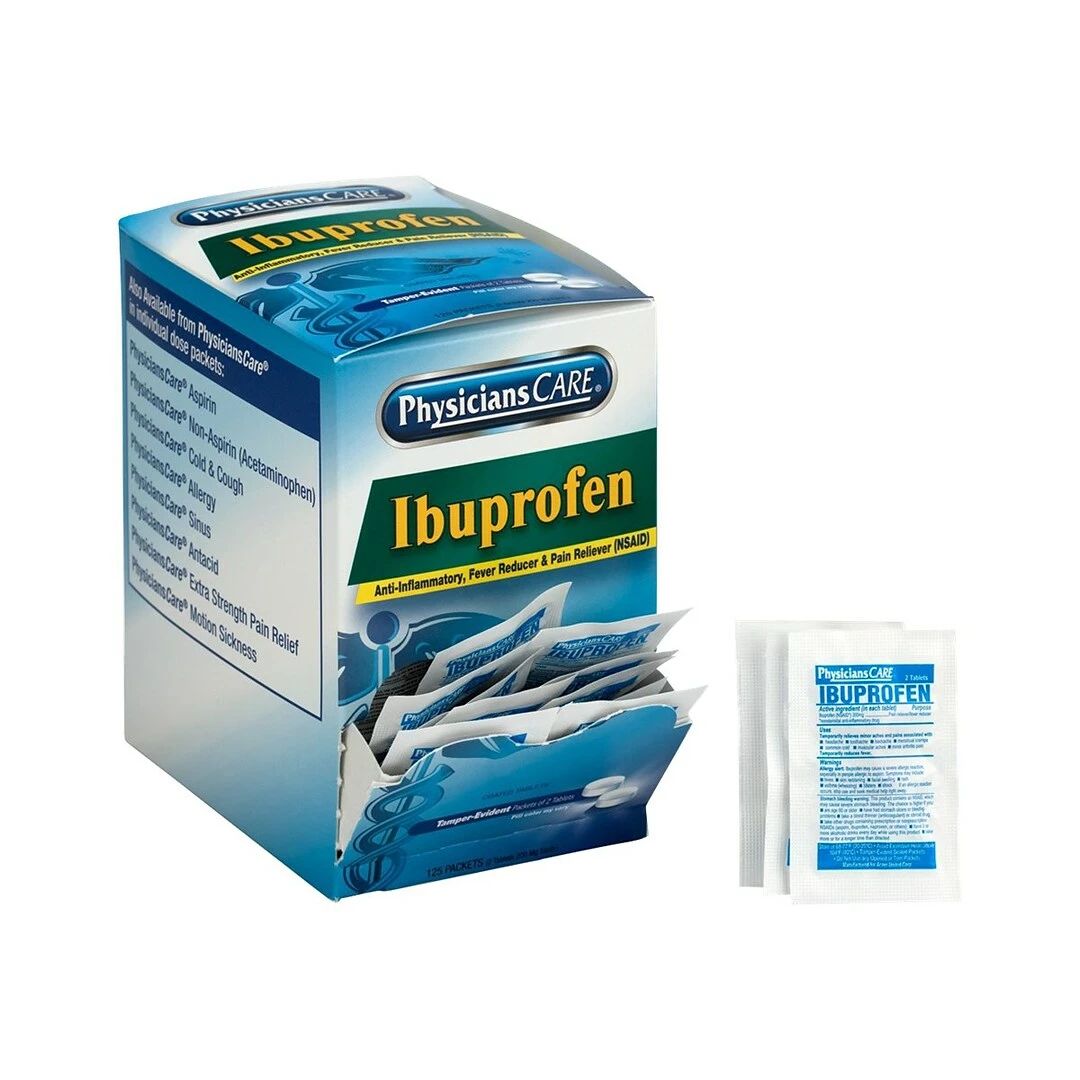 Reduce inflammation, fevers, and pain using the medicine in this box of Physicians Care 200mg ibuprofen. With each dose in this box individually wrapped for freshness and sterility, the box is perfect for stocking office medicine cabinets or refilling first aid kits. Each two-tablet dose in this box of 125-count Physicians Care 200mg ibuprofen contains the same active ingredients as leading brands, ensuring temporary relief from headaches, arthritis pain, backaches, and inflammation.