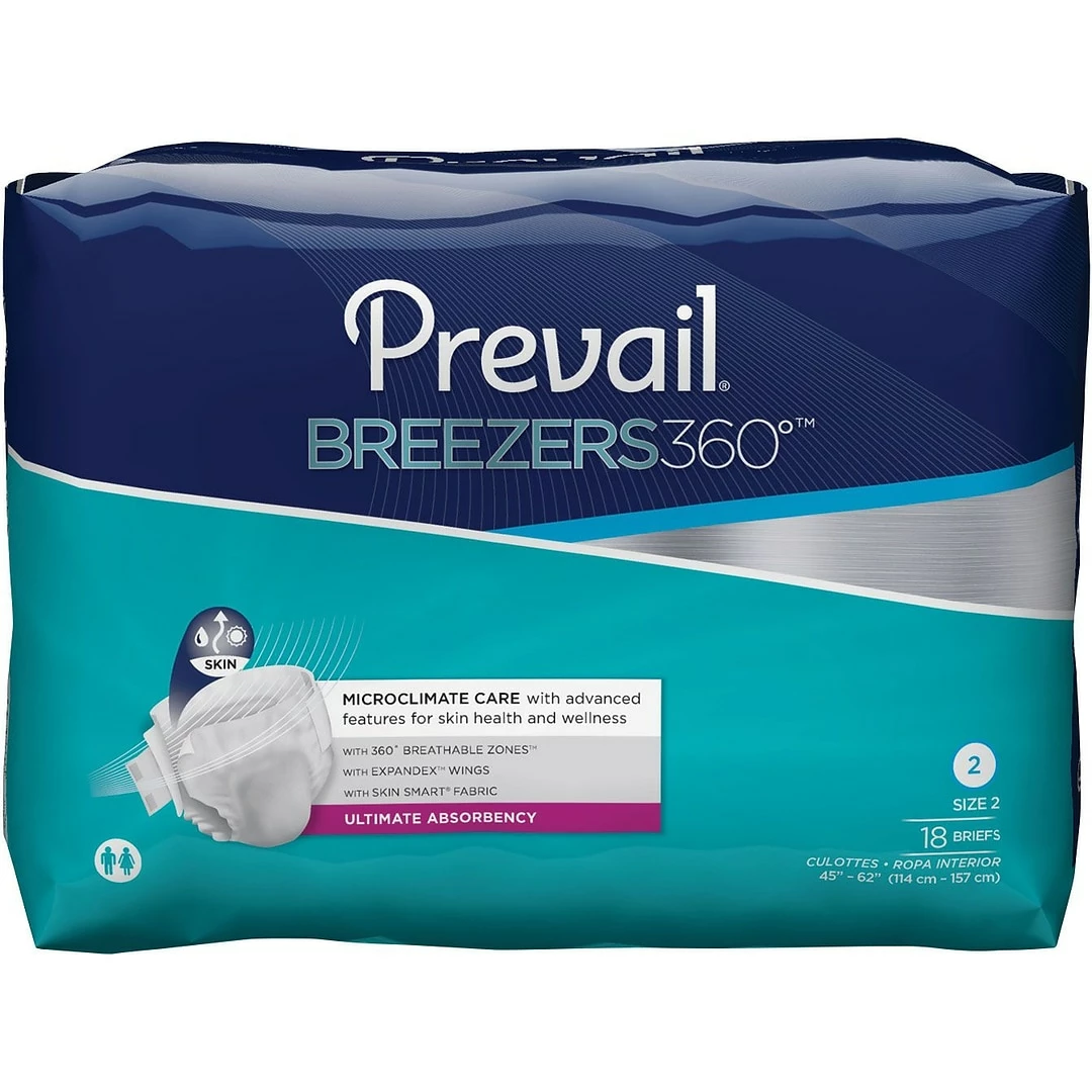 Ideal for heavy bladder leakage, Prevail Breezers360° Briefs provide the ultimate in protection, comfort and breathability. The Prevail Microclimate Care system creates a favorable microclimate by incorporating performance features to help maintain normal skin temperature and moisture at the skin surface, which supports healthy skin. Microclimate Care features includes: 1) 360° Breathable Zones allow air to circulate around the entire brief and help prevent heat and moisture build up, 2) Doublesorb Layers lock up moisture, and 3) QUICK WICK with MaxSoft and a fast absorbing thin core rapidly lock away moisture and odor. Other features include: 1) Skin Smart Fabric helps protect the skin with Vitamin E, Aloe and Chamomile, 2) Expandex Wings offer a contoured fit, 3) Easy-Lock Fastener Strips grip and hold without being sticky, 4) Direct Lock Panels for an adjustable fit, 5) Odor Guard stops odors before they start, 6) Cloth-Like Outer Fabric is soft and comfortable, and 7) our DriFit system provides a new level of protection and skin comfort to help maintain healthy skin.