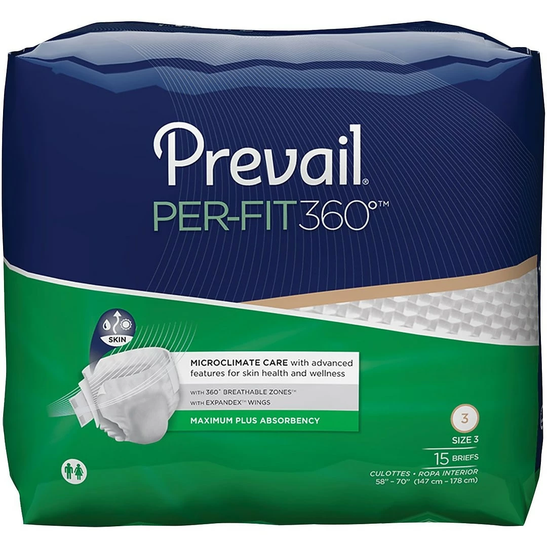 Prevail Per-Fit360° Briefs offer maximum protection, comfort and breathability. They have maximum plus absorbency, which is ideal for heavy bladder leakage. The Prevail Microclimate Care system creates a favorable microclimate by incorporating performance features to help maintain normal skin temperature and moisture at the skin surface, which supports healthy skin. Microclimate Care features includes: 1) 360° Breathable Zones allow air to circulate around the entire brief and help prevent heat and moisture build up, 2) Doublesorb Layers lock up moisture, and 3) QUICK WICK with MaxSoft and a fast absorbing thin core rapidly lock away moisture and odor. Other features include: 1) Expandex Wings offer a contoured fit, 2) Easy-Lock Fastener Strips grip and hold without being sticky, 3) Direct Lock Panels offer an adjustable fit, 4) Odor Guard stops odors before they start, 5) Cloth-Like Outer Fabric is soft and comfortable, and 6) our DriFit system provides a new level of protection and skin comfort to help maintain healthy skin.