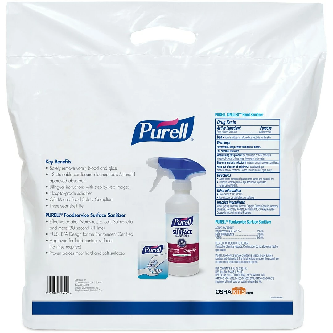 Provides a comprehensive solution to help reduce the risk of Norovirus outbreaks. Safely removes vomit, blood, feces & other body fluids. PURELL® Foodservice Surface Sanitizer is effective against Norovirus, E.Coli, Salmonella and more in just 30 seconds, and is proven effective on most hard and soft surfaces. Protects staff and patrons from exposure to biohazards. Bilingual, step-by-step instructions for ease of use. Sustainable cardboard cleanup tools & landfill approved absorbent. OSHA and Food Code compliant. Approved for food contact surfaces (no rinse required). Includes hairnet, sleeved gown, gloves, shoe covers, eye shield and mask to provide head-to-toe personal protection. Proven effective on most hard and soft surfaces. 3-year shelf life.