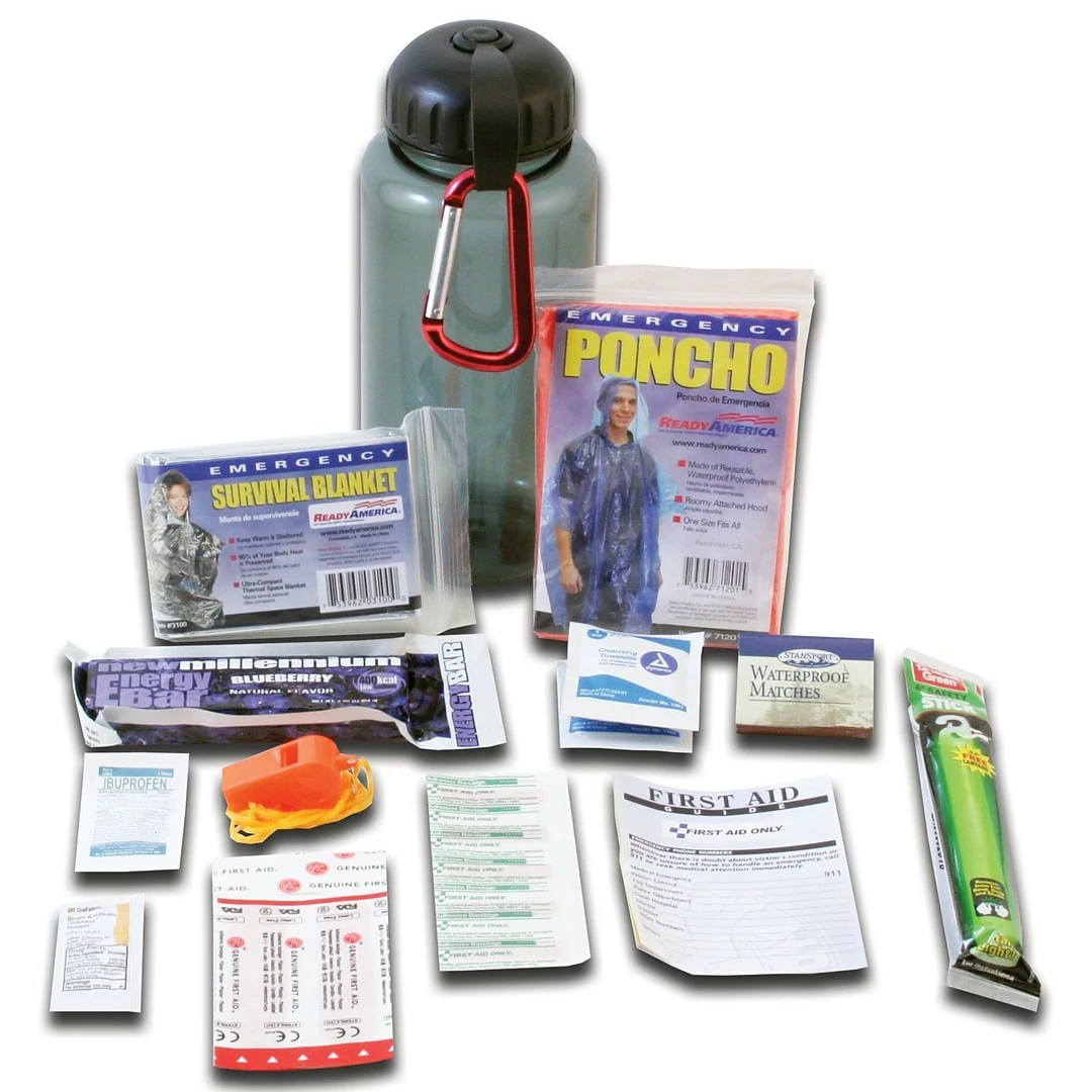 Includes: 32 oz. BPA free water bottle, with a first-aid kit, 400 calorie food bar, rain poncho, survival blanket, whistle, emergency food bar and more for your basic survival