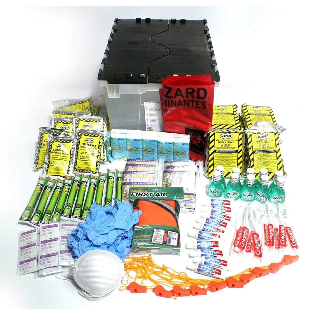 Also includes: 10 tissue pocket pack, 5 bio-hazard bag, 30 pre- moistened towelettes, 10 toothbrush, 10 toothpaste, 10 mouthwash, 1 107-piece all-purpose first aid kit, 1 12 gallon tote