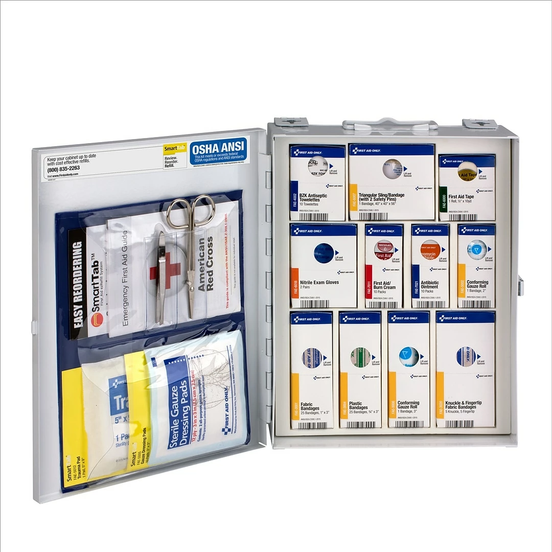 Contains: 25 (1″ x 3″) adhesive fabric bandages, 25 (0.75″ x 3″) adhesive plastic bandages, five knuckle fabric bandages, five fingertip fabric bandages, 10 BZK antiseptic towelettes, one (2″) conforming gauze roll, 10 (3″ x 3″) sterile gauze pads, one (3″) conforming gauze roll, and one (5″ x 9″) trauma pad