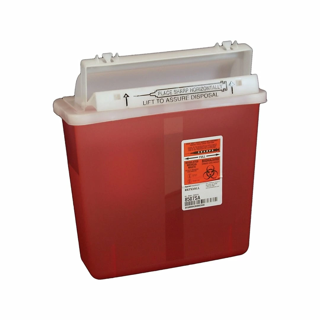 Throw medical waste away safely with these plastic sharps containers. The lid locks once the container is full to prevent leaks, and the thick plastic material safeguards against accidental exposure to the contents. This Covidien SharpStar sharps container holds 1.25 gallons of waste, which is ideal for busy offices.