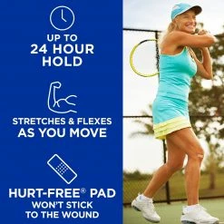 These Band-Aid Brand Flexible Fabric adhesive bandages stay on for up to 24 hours and feature a unique Hurt-Free Pad that won’t stick to the wound as they wick away blood and fluids, allowing for gentle, pain-free removal
