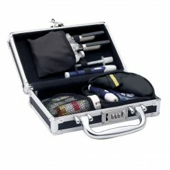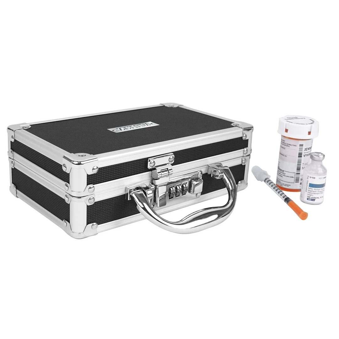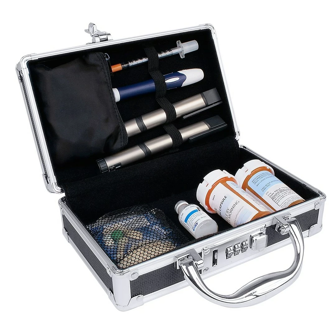Vaultz® Locking medicine case in black color contains removable zipper pouch, roomy mesh pocket, four elastic straps for keeping syringes. Medicine case features handle for easy carrying and combination lock for securing the contents.